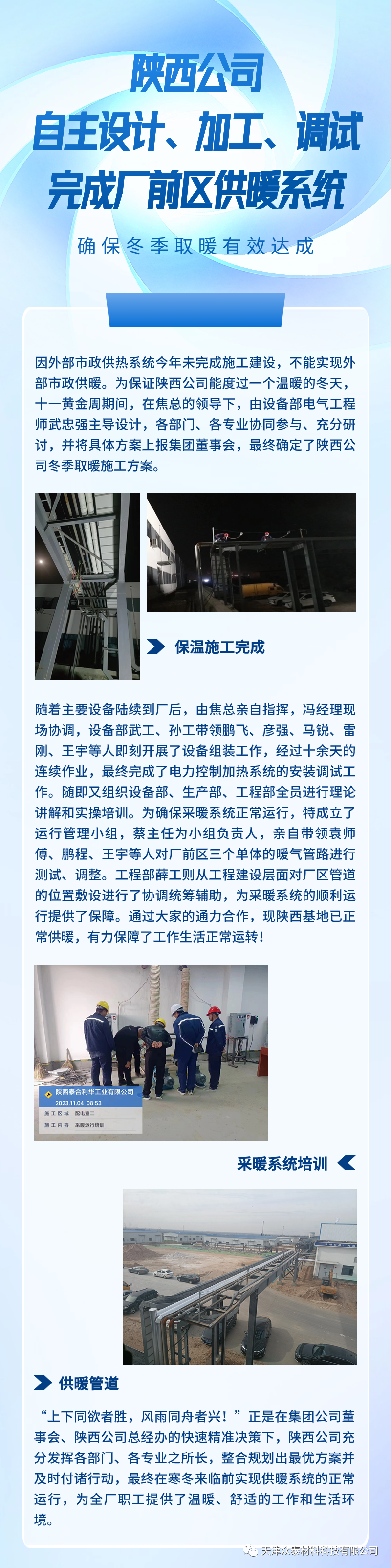 為保證陜西公司能度過一個(gè)溫暖冬天,十一黃金周期間,在陜西公司焦總的帶領(lǐng)下,由設(shè)備部電氣工程師武忠強(qiáng)主導(dǎo)設(shè)計(jì),各部門、各專業(yè)協(xié)同參與、充分研討,最終確定了陜西公司冬季取暖施工方案。通過大家通力合作,現(xiàn)陜西基地已正常供暖,有力保障了工作生活正常運(yùn)轉(zhuǎn)!