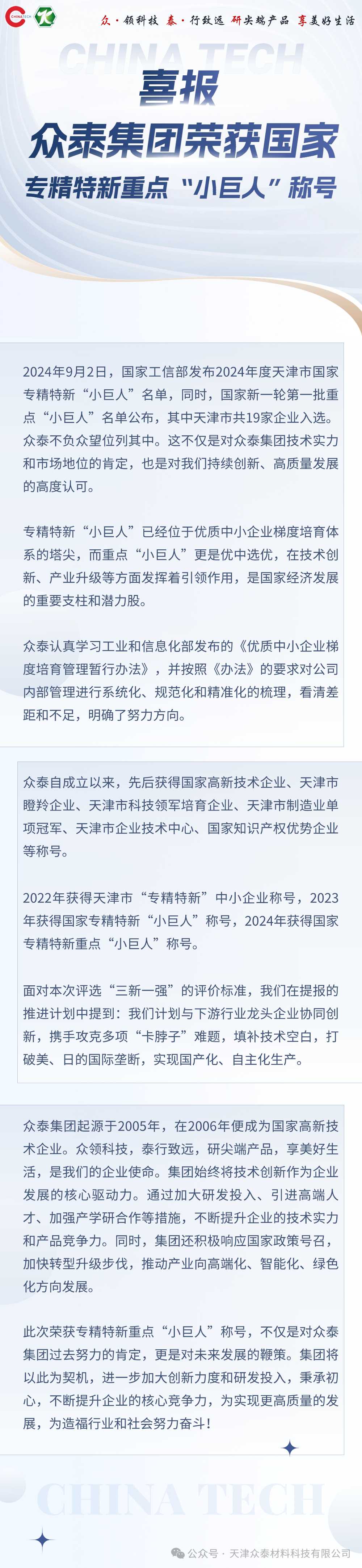 2024年9月2日,國家工信部發(fā)布2024年度天津市國家專精特新“小巨人”名單,同時,國家新一輪第一批重點(diǎn)“小巨人”名單公布,其中天津市共19家企業(yè)入選。眾泰不負(fù)眾望位列其中。這不僅是對眾泰集團(tuán)技術(shù)實(shí)力和市場地位的肯定,也是對我們持續(xù)創(chuàng)新、高質(zhì)量發(fā)展的高度認(rèn)可。